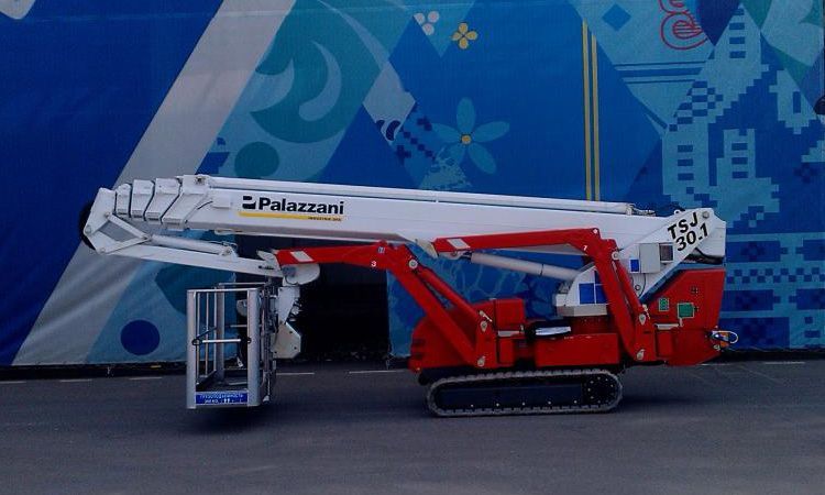 Su cingoli, o ruote, è il Ragno Palazzani classico, leggero e compatto, con braccio telescopico a 5 sezioni e jib superiore articolato.
